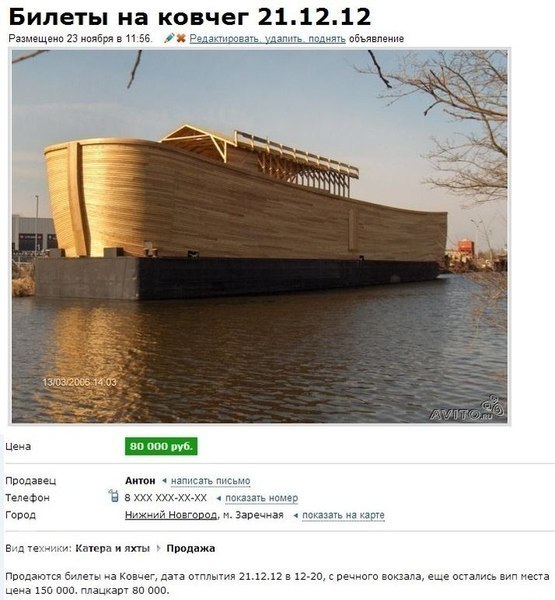Н-да прикол)))) но думаю нашлись такие которые купили, которым 150 тысяч как нам 1 тысяча. Вот только ведь 21 кто говорит просто света не будет. Но я думаю так что если будет конец света , то и ковчег не поможет, просто не станет нашей планеты земля... у нас кстати на местном форуме тоже ведутся бурные обсуждения по поводу конца света, типа один задал вопрос кто куда побежит или поедит и началось, иногда смешные суждения пишут... и реально люди верят и собираются бежать опдальше от Москвы))))