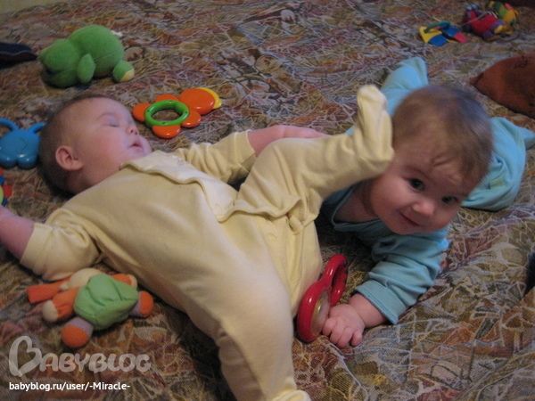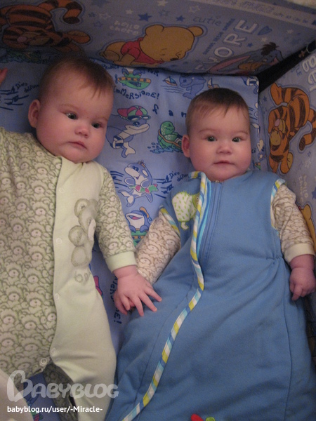 И немного "статистики". Варя весит 7 400, рост 66 см; Егор 8 300, рост 68 см. Развиваются по возрасту, у врачей претензий нет. Из нового начали говорить мамам и бабаба, ну и всякие лепеталки смешные и трудно воспроизводимые.