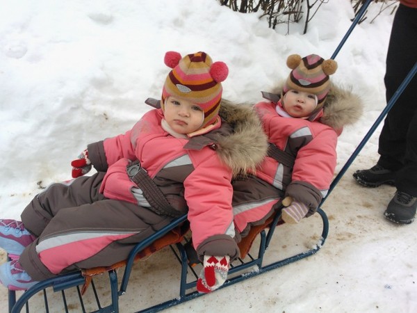 Девочки сидели хоршо,я не успела купить матрасики с ремнями,потому постелила шерстяное одеялко,а привязала их пояском от курточки к спинкам,не падали))))))Час колесили по заснеженному району,все на нас глазели и пальцами тыкали...