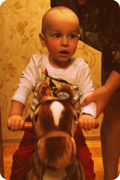Нам подарили прекрасного коня, думала будут ссорится из-за него, но нет. Яромир в него влюблен, не отходил весь вечер, а вот Святослав обходил за метр, про то чтобы сесть и речи не было-сразу в крик. Он очень испугался маленькую паровозик-каталку (сработал громкий звук едущего поезда) и теперь ко всем вещем, на которых нужно кататься относится настороженно. Правда под конец вечера все же подошел покрутить колесо у лошадки ))
