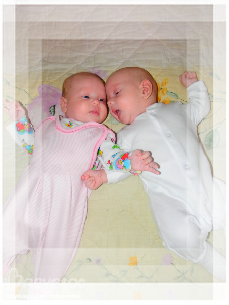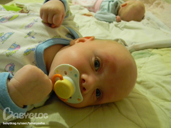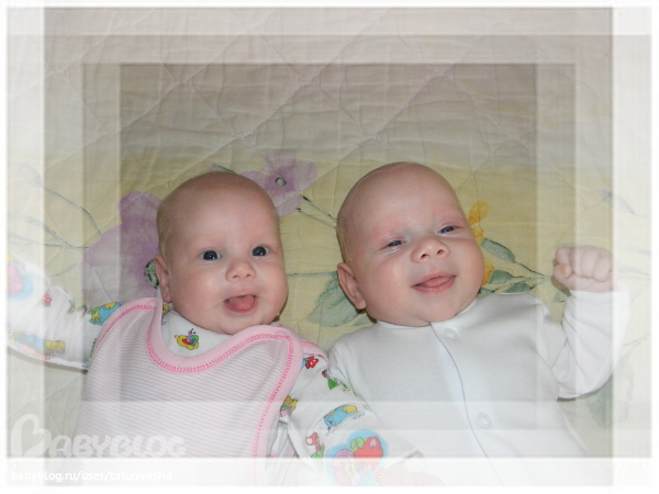 Моим котяткам целых два месяца!Так быстро время пролетело!Они очень изменились и внешне и характером.Животики все меньше нас беспокоят-это самое главное!Стали мешать друг другу спать в кроватке,поэтому мы их расселили по разным кроваткам))Теперь все семейство спит с 23ч до 6-7 утра!!Кайф))Тимоха стал меньше кряхтеть))Но прозвище Медведь у него остается еще)))Вообще Тим у нас очень улыбчивый и разговорчивый паренек!Особенно любит разговаривать с пчелками на мобиле))Любит купаться и делать зарядку,а еще он стал ТАКОЙ хомяк,уже 5400 весит))Если голодный или вылетела соса-узнает об этом весь дом)))Лизонька у нас дамочка серьезная))Улыбается больше папе,да и вообще мужскому полу,больше чем мне))Разговаривает по настроению,но обязательно выговаривает четкое "Агуу".Нравится ей следить за игрушками,трепать маму за волосы,купаться в пенке,когда мама делает массажик.Сколько весит не знаю.Вот пойдем в поликлинику и измеримся там.Лизок какает все так же раз в день.Зато прогресс- стала чаще есть титю,в отличии от Тима!Это меня очень радует,может все таки меньше смеси кушать будет хотя бы Лиза.А так все более менее спокойно.Когда одни с мамой так вообще дома тишина у нас,у меня много времени уходит на старшенького.А когда папа дома,они почему то начинают выпендриваться и требовать много внимания к себе,не знаю почему так))Вобщем растут мои двойнята,становятся все интереснее!Ну и немного фот