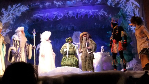 Началось представление...про Зимушку зиму...девочки затаив дыхание смотрели на сцену...на падающий снег - ловили снежинки, хлопали в ладоши, что-то выкрикивали, квакали, когда кикимора с лягушками пели, Софи даже танцевала сидя =)) Очень им понравилось...судя по их эмоциям =) Отсидели отлично 25 минут представления!