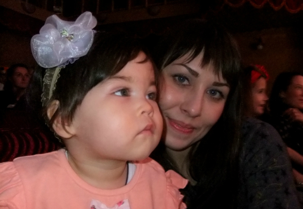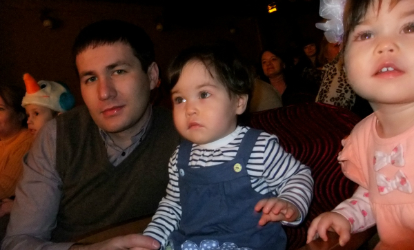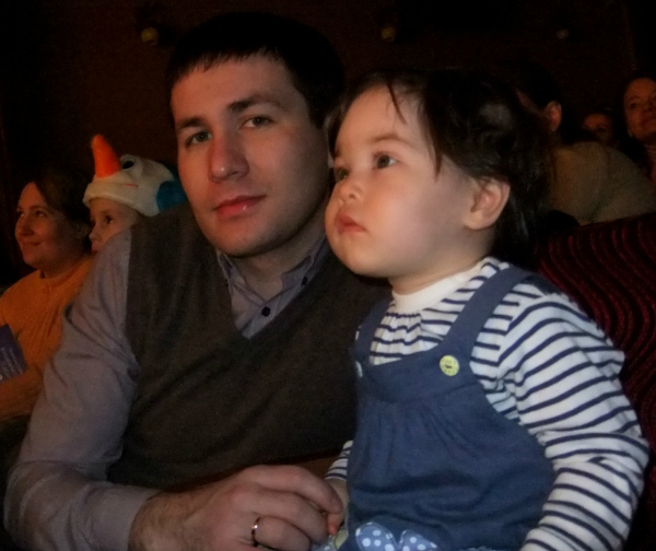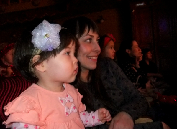Приехали к 11:00, разделись, переобулись и пошли в зал...у нас был 2 ряд, места по центру...девочек посадили между собой (там для деток маленьких можно кресло сложить и получается высокое)...всё видно! Т.к. новогодние наряды ещё где-то едут до нас..костюмов мы не шили, пошли просто в платьях...думаю на следующий год можно уже их в кого-нибудь нарядить =)