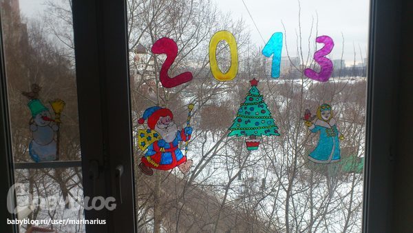 А на окне у нас поселились новогодние герои, нарисованные витражными красками.