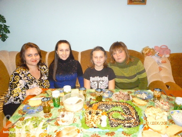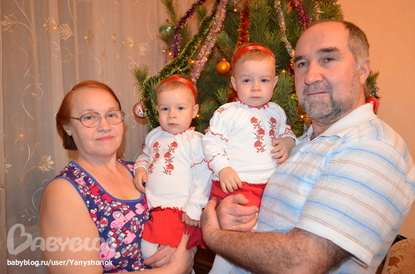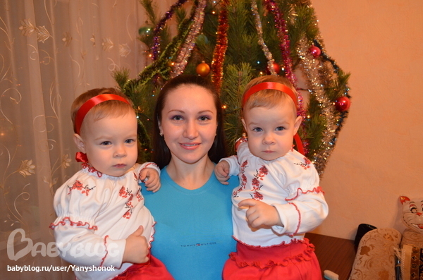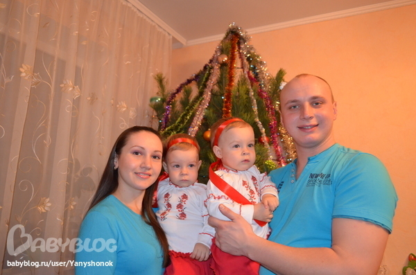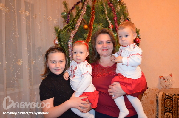 Во-вторых, хотелось бы рассказать и показать, как встретила год Змеи наша дружная семья. По традиции, которая образовалась у нас год назад, мы накануне Новогодней ночи переодеваем своих доченек в костюмчики и все дружно фотографируемся с ними у ёлочки. Участие принимают все: бабушка с дедушкой, тётя, двоюродная сестричка, ну и мы, конечно-родители. В прошлом году мы были маленькими зайками с плюшевыми ушками, а в этом нарядились в национальные украинские костюмы и встречали Новый год "щирими українками".