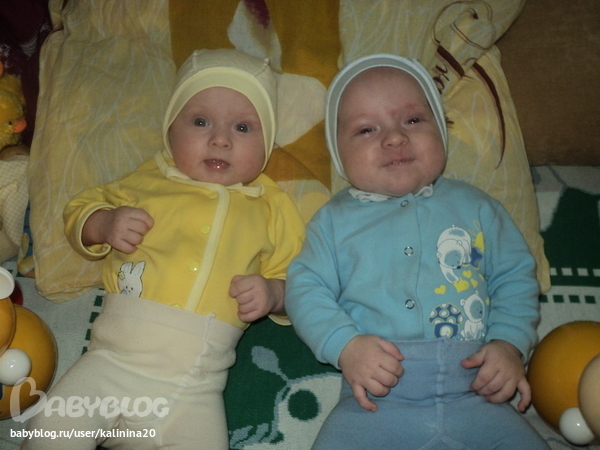 Двойняшки до 1 годаВот нам и 4 месяца!!!УРА!!!Прибавили мы немного Макар сейчас 6400 62см,а Варюшка 5800 63см. Переворачиваемся мы только на бок,изредка перевернемся на живот,когда совсем голышки переворачиваемся с живота на спину!Смеемся в голос когда целуешь их в шечки!кушаем мы яблочное пюре,кабачок и совсем немного кашки,от яблока морщиемся!Нравится когдаа рядом стоит неваляшка задеватьее укой!!!У Макарки вылез первый зуб,так что мы теперь зубастые!Слюни текут ручье у обоих и руки из-за рта не вытащить,поэтому все игрухи которые им даем сразу в рот!!!Вроде вот и все