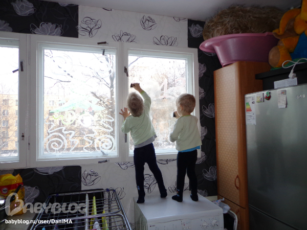 Пока мама с заклееным глазом мыла посуду, детки смывали снежок/елочку/надписи.