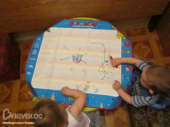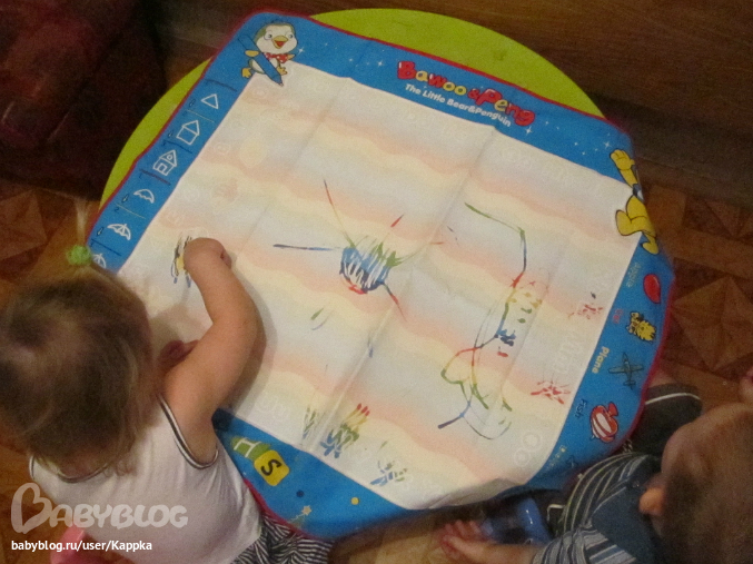 пробовали рисовать не маркерами, а кисточками. мне не понравилось, т.к.: им хочется после каждого(!) мазка окунать кисточку в воду. как итог - все в воде)). за 2 секунды мочат весь коврик так сильно, что его надо просушивать.