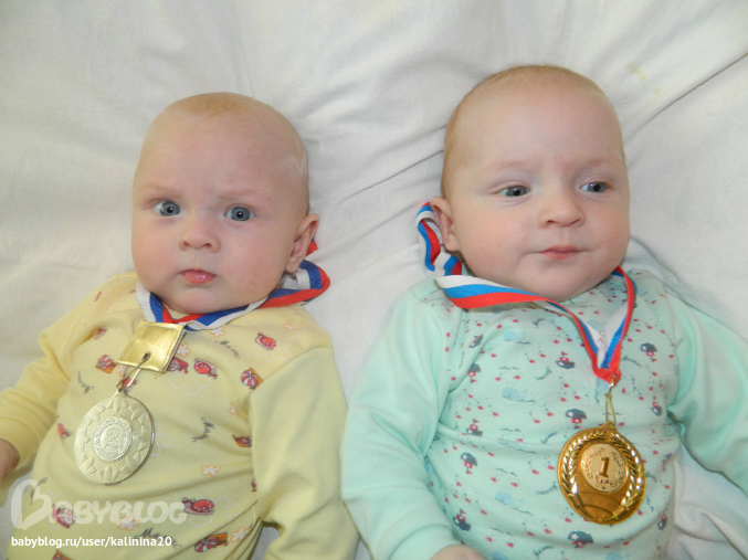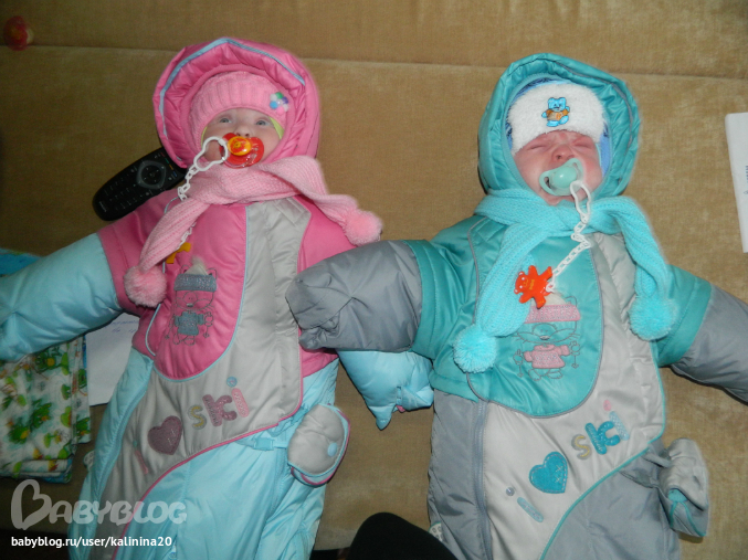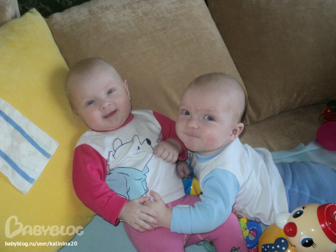 Двойняшки до 1 годаТак быстро летит время,этот месяц промчался незаметно и нам уже 5!!!В поликлинику мы не ходили в этом месяце,так как много людей болеют гриппом и даже с летальным исходом поэтому рисковать не стали.взвесились дома Макар 7200,Варюшка 6500,это приблизительно взвештвались на моих весах и мама слон блин 62, получается надо еще 10 кг сбросить))). ну и наши успехи: У Макарки все так же один зуб, переворачивается хорошо с живота на спину,а на живот сам пару раз пробовал а потом что-то перестал,хотя любит лежать на животе,в своей кроватке переворачиваемся на бок и хватаемся ручками за перкладинку и долго так лежим. все игрухи тянем в рот,если они рядом лежат то берем их сами,стали дергать неваляшку за уху и перетаскивать на другую сторону. Варюшка любит переворачиваться со спины на живот,хотя сама лежать не любит на животе,игрухи так же все берем и тянем в рот,пинаем неваляшку с такой силой что она улетает с дивана. Оба научились вытаскивать соски, но обратно пока правильно засунуть в рот не получает. Борьба с пеленками идет можно сказать успешно,ночью спин уже развернуты,но днем не всегда получается,да я и перестала париться по этому вопросу. Кушаем мы по 150 мл смеськи больше не хотят,яблочко,кашку рисовую или гречку,а еще любимые ими брокколи и цв.капусту(хотя меня от них тошнит). ночью кушаем в 00:00 и 05:00,хочется убрать одно кормление но пока не получается)))