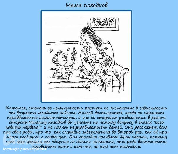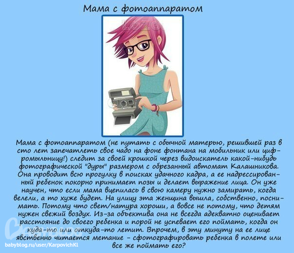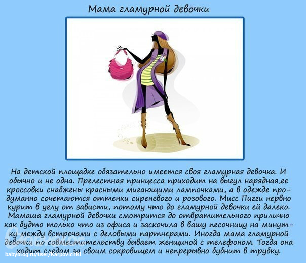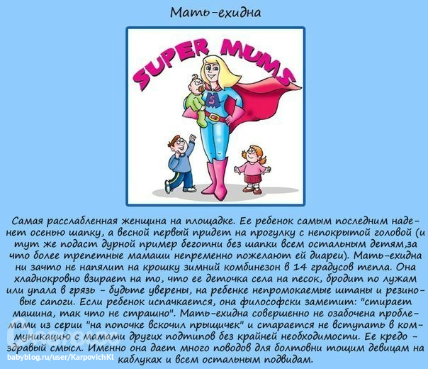 До сих пор я была матерью ехидной (с первой дочкой). С новоиспечёнными сорванцами мы пока на площадку не ходим, очень боюсь стать похожей на мать погодок, когда буду стоять в растерянности и думать за кем вперёд бежать))) Изредка бываю мамой с фотоаппаратом, но надолго нас не хватает))) К слову сказать действительно - сталкивалась со всеми типами мамаш))) Классная подборка!