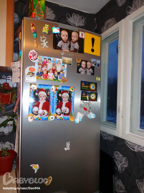 А вот наш холодильник. Теперь на своем месте, не в комнате, а на кухне. На нем фоточки с детского садика.