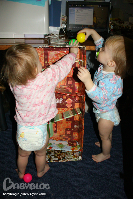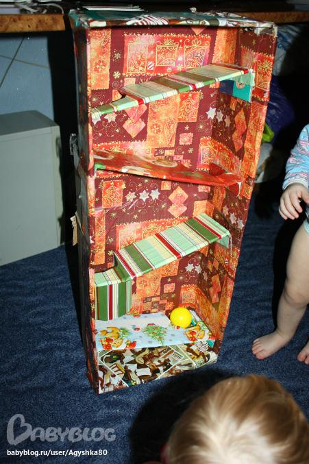 Новинка -из самоделок.Что то типа лабиринта-на полочках дырочки-шарики скатываются по полочкам-детям нравиться(координацию движения отрабатываем(нужно в дырку мячики кидать),внимательность и логику,ну и свойства предметов)в шариках горох(для устойчивости и звука)