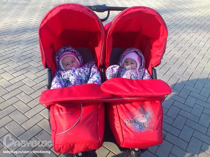 Плюсы: Колясочка очень яркая, легкая в управлении, удобные сидения и широкие очень....мои дочки в комбезах зимних свободно помещаються, управляеться одной рукой, колеса передние поворотные и они не сдуються....Чехлы на ножки хорошие!!!!