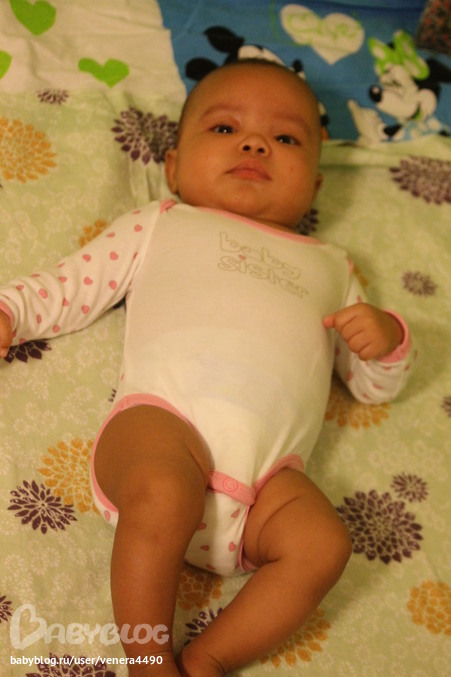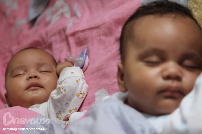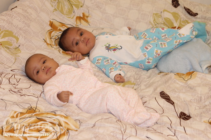 В целом,дети полностью соответствуют развитию 3-месячного ребенка-оба улыбаются и гулят (особенно это получается у сынули),доча более серьезная натура. И очень уж она любит РУКИ!!! Попробуй не возьми-будет плакать до последнего!) Головку держим хорошо,Феликс еще и переворачивается с живота на спину. Кушаем 6 раз по 150-160 мл нашу русскую НАН. Мы на два месяца запоздали с прививками-нам их недавно все проставили. Наша няня вернулась обратно,так что у меня есть время и выспаться,и по делам съездить,и даже на маникюр-педикюр сходить)