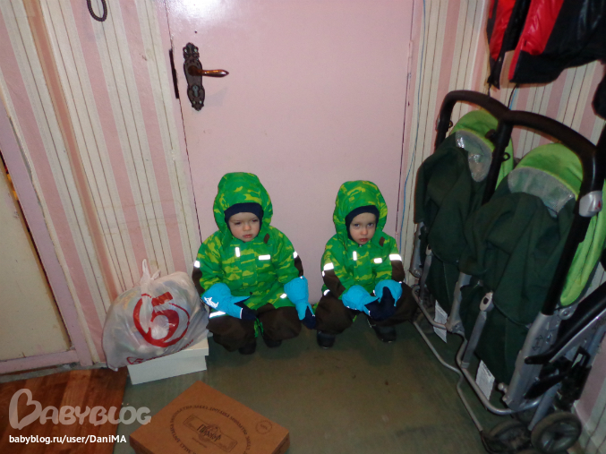 Перед садиком. Всегда одену их, они ждут меня у двери, я пока одеваюсь.