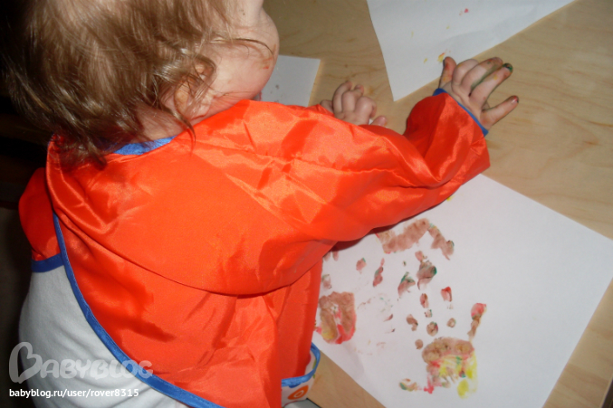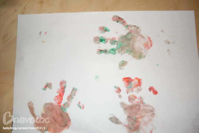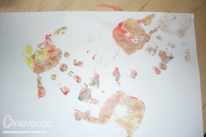 Задание было такое я сделала 3 точки разного цвета, дети должны были все эти точки смешать в большую лужу и сделать отпечатки своих ладошек! Скажу сразу Иришка была в восторге, Андрюшка как-то видимо не очень понял