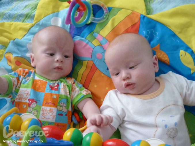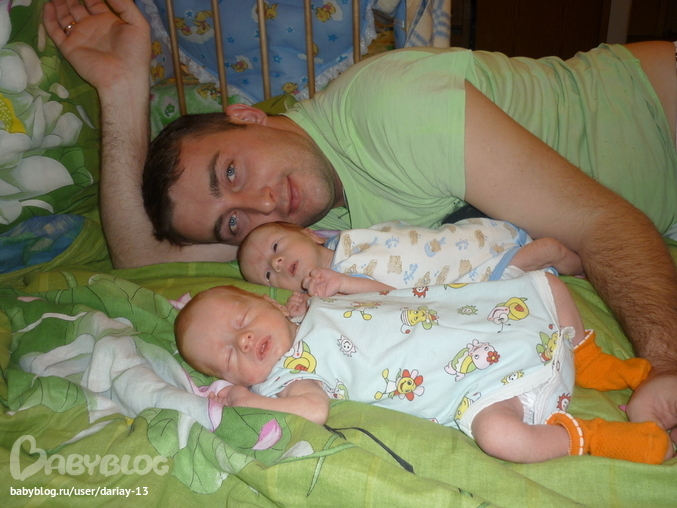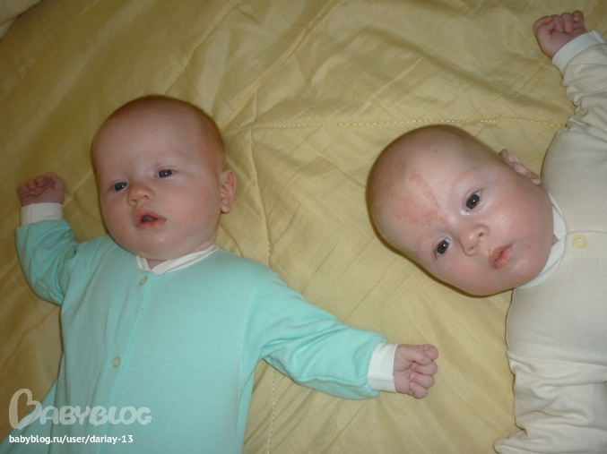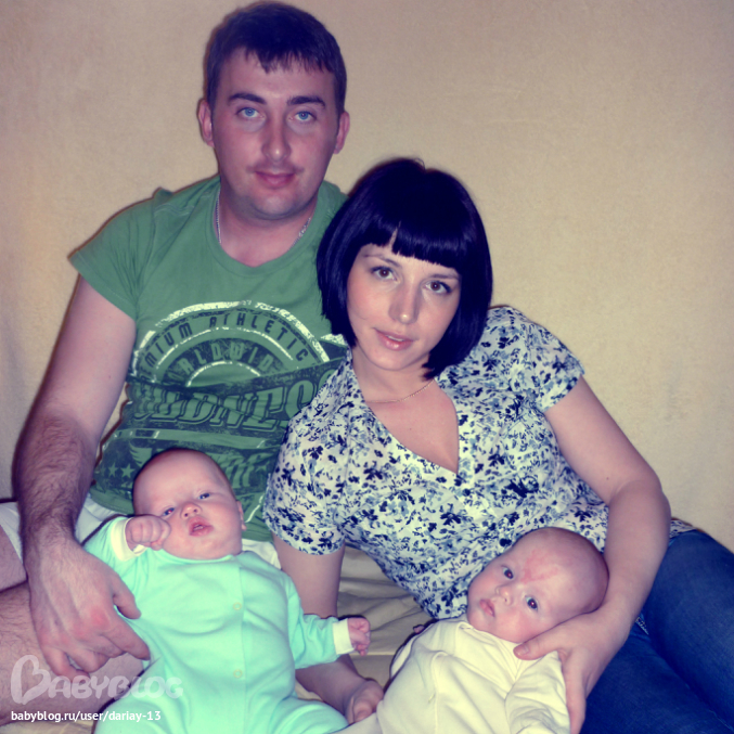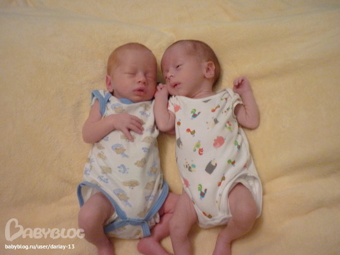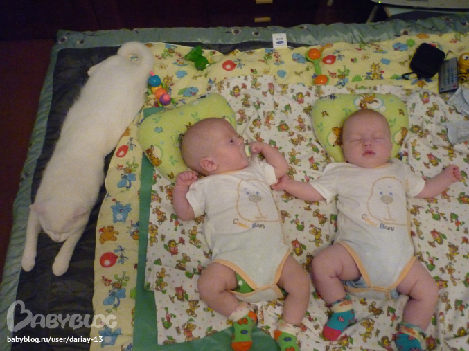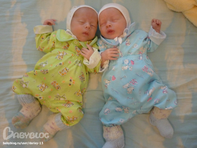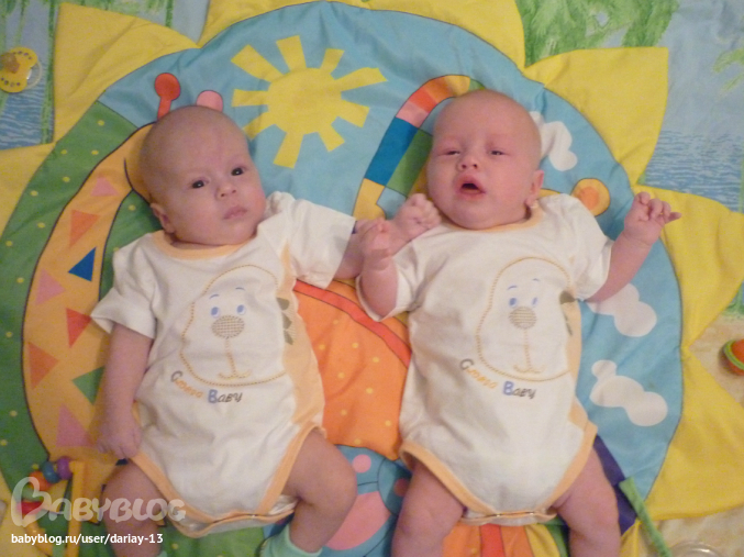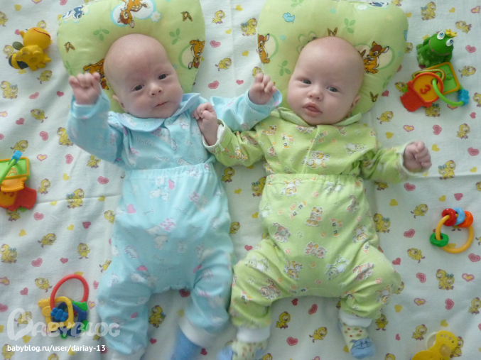 Это была моя вторая беременность, первая не удачная. Двойня для меня не была неожиданостью, наверное, внутренний голос подсказывал и я говорила мужу что возможно их двое(хотя срок был маленький - 6 недель) и я не ошиблась, чему безмерно рада. Помощников у меня нет - муж офицер, редко бывает дома. Но меня это не огорчает мне безумно нравиться возиться со своими крошками.