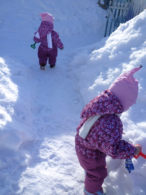Девочки и туда и обратно шли ногами,ходят довольно быстро(еще и в новой одежде 100% легче),держали маму и папу за руку,а в другой руке лопату