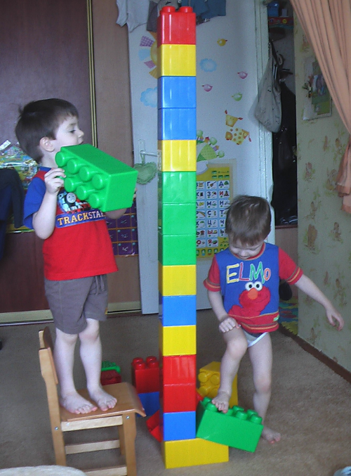 Сейчас малые строят большой сапог(ввиде башни)сапог потому что я им строила робота и у робота были ноги.А они решили что это сапоги))))