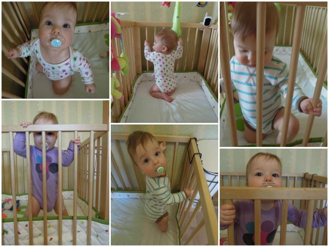 На 11-м месяце Дрон окончательно освоил поочередно ползание, вставание на колени и стояние на ногах, теперь в кроватке они либо спит либо стоит :) без каких либо других вариантов... мастерство вставания за пределами своей кровати он почти не применяет, только в ципре иногда... может оно и к лучшему :)