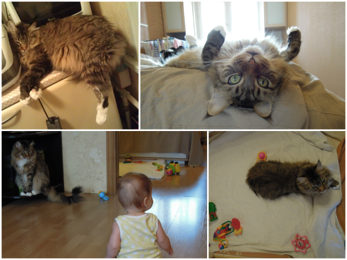 Кошак очень интересуется детьми и их игрушками, но после того, как Дрон нашел его поднос с едой, он как видит детей на полу сразу бежит охронять свою кормушку, если его засекли сразу оба ребенка он быстро прикидывается дохликом, а самое классное у кота время, это когда дети спят и можно поволяться на их коврике с игрушками )))