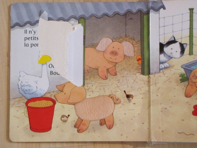 Это были такие картинки за которыми пятались животные,все вырвано с корнем.Книги разорваны - ни начала ни конца.Если животные двигались,то обязательно все вырвано.Если тонкие листы - оторвано.Музыкальные книги - погрызен и сьеден переплет.....Но что поделать,к книгам любовь надо прививать,пусть хоть такую :):)