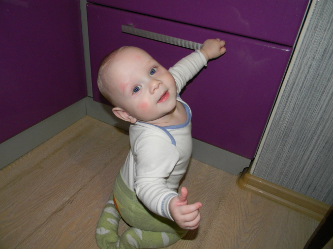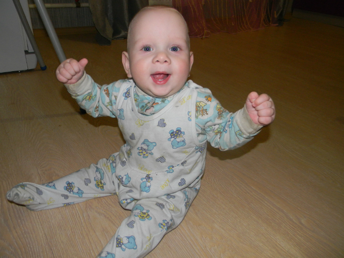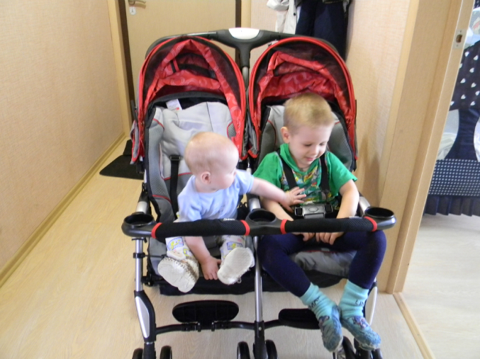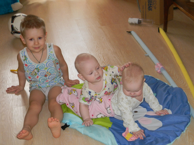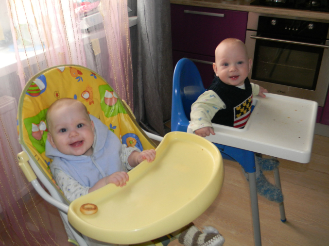 Моим младшим котятам 7 месяцев,а старшему котенку 3,5г!Большуныыы!!Двойнята заметно подросли,уже целый пакет маленьких вещей собрала))Тимоха 9кг,Лизун 8,2кг.Оба 67-68см.Сделали им курс массажа.Итог- Лизок начала ползать по пластунски,сидеть увереннее стала,но правда сама не садится,но пытается!Тимохин встает на коленки,несколько раз встал на ножки у дивана))Шилопоп еще тот))Всё ему интересно,везде лезет,шишек на голове кучу набил))а Лиза всё за ним пытается ползать!У обоих по два зуба,у Тимона третий лезет с низу.Тим конечно реагирует на зубки ужасно((Капризничает,настроение переменчивое,мамсиком становится,ночью просыпается частенько,плачет((Вобщем психунчик маленький!У Лизы зубки вылезли втихоря,ни намека на зубы))Оба такие меломаны,как музыка заиграет сразу впляс))Так смешно))Погремухи и прочие игрушки нам не интересны,играем в мамину посуду,в игрушки старшего брата))Спим теперь раза два-три в день.С приездом коляски,стали чаще гулять,хоть и погода жуткая,ветрище дурацкий и тучи каж день((Надоело уже,честно((Так охота снять уже им весеннюю одеху и гулять в кофточках,штанишках!Кушаем мы по прежнему смесь,много овощей(очень их любят они!),по немногу фрукты кушаем,но не с таким удовольствием как овощи))Попробовали тут мяско,Тим не понял,а Лизка всю банку слопала)))Любим сушки грызть,яблоко,огурец им понравился)))Каши едят когда как.Варю им компотики яблочные,тут компот закончился,дала им сок с мякотью(кто то принес)так потом такие какахи былии))Больше не даю такое!Я сильно с прикормом не настаиваю,мы ведь пока только знакомимся с новой пищей,если не хотят есть,я и не даю.Главное что им очень нравятся овощи лопать!Прививку вторую мы так и не сделали,хотя невропатолог разрешил,просто у Тимона сопельки немного от зубов.Ждем когда пройдут.Савёлка у нас всё по гостям ездит.Учимся с ним писать буквы,пока получается хорошо!В его физиоцентре сейчас выходные,поэтому занимаемся дома ножками.делаем ему курс озокеритового обертывания,сначала ноет,потом нравится))На неделе будем покупать ему ортопедические стельки,заодно посмотрим для мелочи ортопедическую обувку.Напишу несколько слов о нашей коляске Жетем Элегант Твин.ОЧЕНЬ я ею довольна!Безумно легкая(после нашей жетем Зум),управляю одной рукой.Очень нравятся капюшоны,чехлы на ножки теплые,только иногда сползают,но детям это не мешает.Управляется легко,через бордюры легко,а заносить по лестнице в подъезде просто сказка,причем вместе с детьми!!!Складывается компактно,столько места теперь в коридоре!И переносить ее удобно до машины!Вобщем очень надеюсь,что она нас не подведет в дальнейшем!Ну и фоточки напоследок
