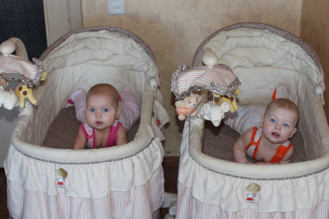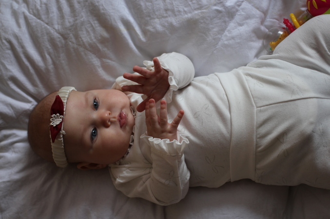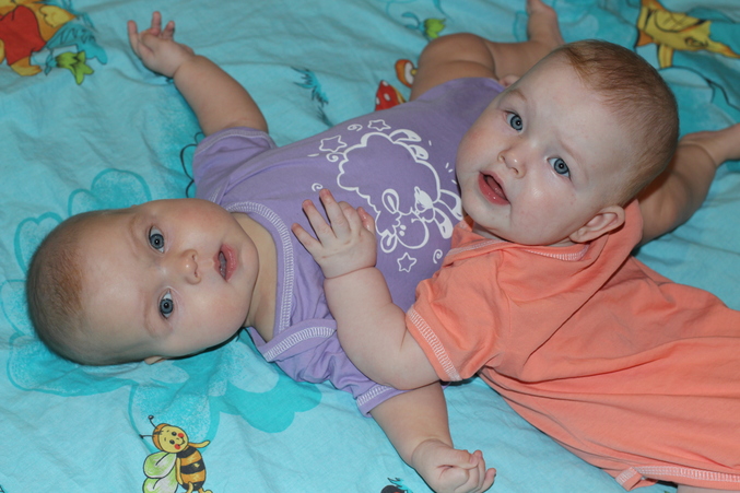 Ирочка не сидит , но пытается если не получается просит чтоб ее посадили, попытки встать на четвереньки пока только переворачиваемся и ползаем по пластунски, но так шустро глаз да глаз если на диване лежит))) Очень любит расматривать свой ручки и ножки вообще очень любит все расматривать такой вдумчивый взгляд вообщем наблюдательная девочка, даже сестренку трогает так острожно в отличии от Лены, та как на пролом