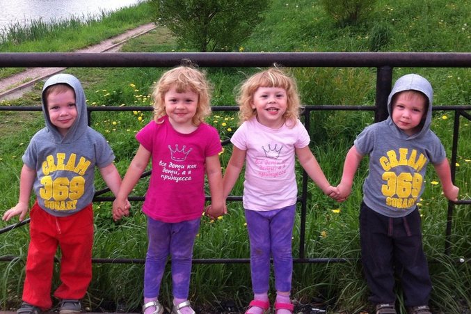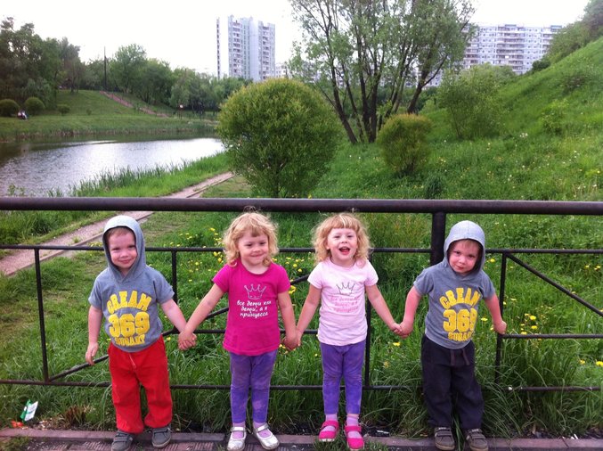 Ну, и так всегда) Еще частенько слышим, как стоя рядом люди спорят - это два по два, или это четверняшки. Косятся на нас, пытаются понять, кто там мама, а кто вообще кто. И еще ладно, если мы с Таней гуляем вдвоем с ними, а еще бывает рядом и Ира (танина сестра) и Андрей (муж мой)... Иногда веселим, говорим - "да четверняшки! вот все ее!" или отвечаем честно - да, две пары близнецов. ))