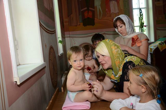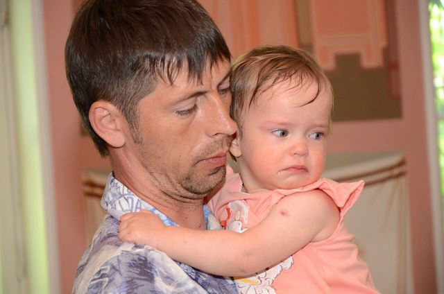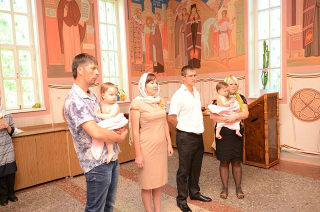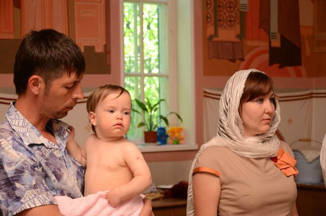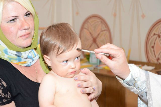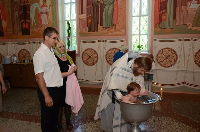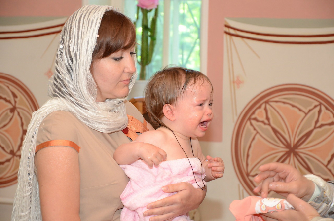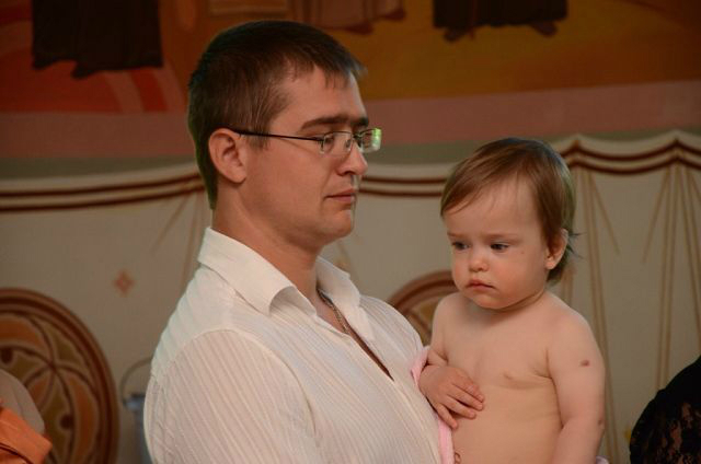 Девочки вели себя в общем-то неплохо. Полиночка с интересом наблюдала за происходящим и батюшкой, пока тот не стал окунать ее в воду - такого молча снести она не могла и рыдала пока ее не оставили в покое. Танечка же батюшку невзлюбила сразу - то ли ей цена вопроса в 4 тыс. рублей (не считая покупки свечей, иконок, крестиков и проч) показалась высоковата, то ли батюшкин пятый айфон показался неуместным, но она всячески пыталась от него убежать и изо всех сил карабкалась на своего мужественного крестного ))) Когда же батюшка взял ее, чтобы окунуть в воду, она вырывалась так яростно, что бедный батюшка решил сдаться, усадил ее сразу в воду без окунаний и быстренько закончил водные процедуры. Так что мы теперь крещеные, я этому очень рада. Девчонки теперь ходят с крестиками, несмотря на мои опасения, они им совсем не мешают.