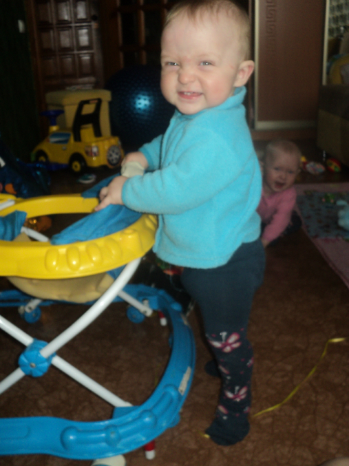 Двойняшки до 1 годану вот нам уже и 9!!! я думала что до этой цифры еще ой как далеко,а тут,время пролетело незаметно! Зубиков у нас у каждого по 6 штук, по 4 сверху и по 2 снизу!Макарка сейчас весит 8800, всего 100г за месяц прибавил,но это неудивительно,как мы ползаем по квартире не угонишься за ним,начал сам вставать и немного перешагивать у опоры,поэтому в коляске для нас сидеть это уже в прошлом, уже обзавелись сандалями. его рост 72 см. Варюша весит 8400,ползаем только на животе и на.... попе,чаще все на попе получается у нее очень быстро уже может так добраться до кухни)))),ей надо шагать,поэтому когда в доме появляются свободные руки,они сразу начинать водить детишек по квартире и на прогулке. кошка у нас давно стала кых,но в этом месяце мы виделе много животных и птичек и пока все они у нас кых)))).недавно познакомились с цыплятками,так мы почему то сразу открываем рот когда нам их подносят!!))) днем сейчас спим два раза засыпаем сами,а вот вечером пока надо качать,почему то не получается у них заснуть самим. появилсят в нашем доме манеж,так варя там может сидеть час а то и больше и спокойно играть,меня это очень радует.Вроде много всего произошло в этом месяце,но все вылетает из головы,так что просто наши фоточки!!!