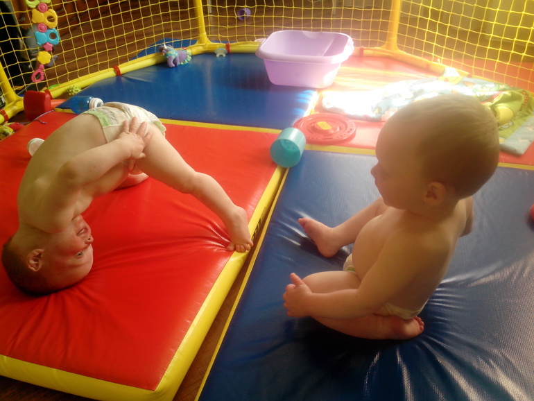 у нас тоже был такой вопрос. двойняшки такого же возраста. и мы придумали и купили боссейн размером 2,5 на 1,7. надули))))постелила туда одеяла и дети рады и я счастлива. друг от друга далеко,не налазиют пока езе,есть стимул доползти друг к другу. и на следующий год у нас будет боссейн для деток