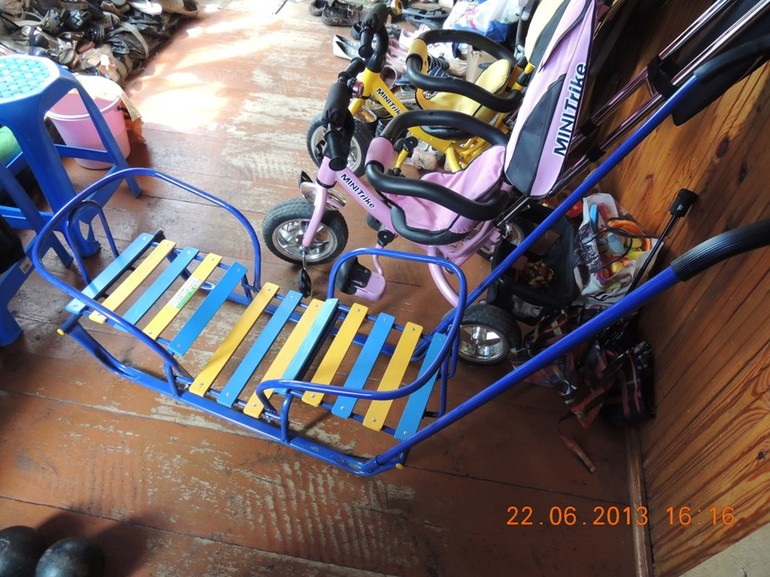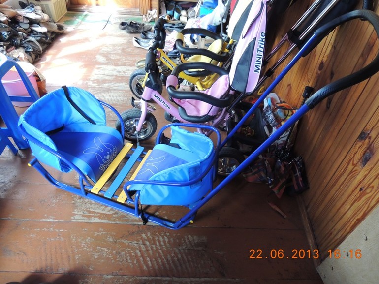 Можно купить такии 2 штуки. и если ваш папа умелец скрепить их между собой, будет удобней. У нас двойняшковые - на против друг друга, мне не нравится, так как вес большой, куда то забраться проблематично, можно без ручки остаться, и место для ножек маловато. На эту зиму куплю раздельные и скреплю. лучше брать с более реальной ручкой не такой как на фото.