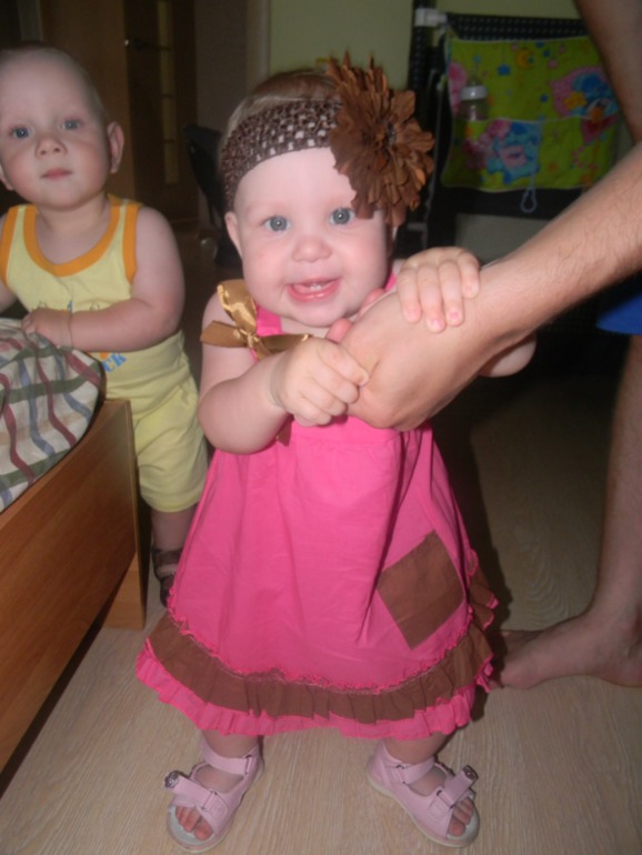 Двойняшки до 1 года Растут мои кракозябры))Но этот месяц какой то затяжной был((То ли от того,что зубы лезли тяжело у Лизы,постоянные капризы,то ли от того,что Савелька пошел в садик и день тянется теперь долгоо))Взвесила их сегодня- Тим 10,2кг,Лизок 9,2кг.Рост не измеряла,потом с папой измерим.Начну с Лизуна.У нас долгими мучениями вылезли 3 и 4 зубы сверху,уууф,я рада,а Лиза тем более))Теперь мы счастливые,всем улыбаемся,играемся,кушаем хорошо и спим!Стала много слогов разных произносить-ма-ма,па-па,ба-ба,га-га,дя-дя,да-да,ня-ня,дай-дай,ка-ка,та-та.Мы с папой дали ей кликуху Улитка))Т.к. делает все медленно,с осторожностью))Так же шагает вдоль опоры,ползает на четвереньках,любит собирать всякие крошечки,ковырять что то.Любит слушать стишки детские(благо я их выучила кучу еще со старшим))хлопает в ладошки,делает "полетели-полетели" ручками,пытается делать руками "шарики-фонарики",танцорша такая))Большая любовь у нее к папе,смотрит на него с предыханием,целует его))Вечно ноет от Тимы,он просто ее потрогает,а она в слезы