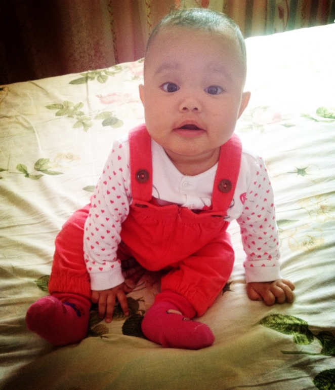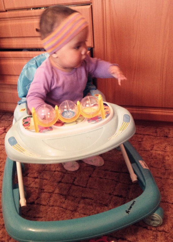 А вот и Соня стоит!Фото сделано неделю назад,сейчас стоит более уверено. Подъезжает к дивану,берется одной рукой за краешек и стоит. Летает по дому на своей "машине", рвет листья на цветках и вырывает провода из розеток))