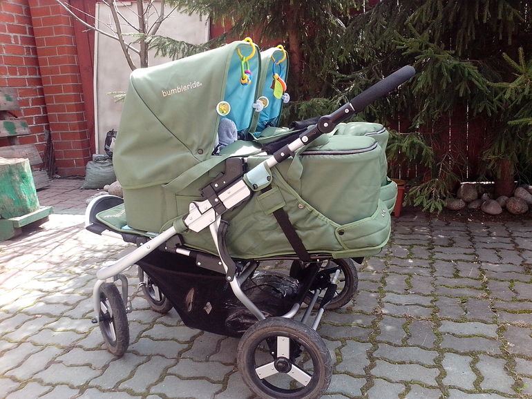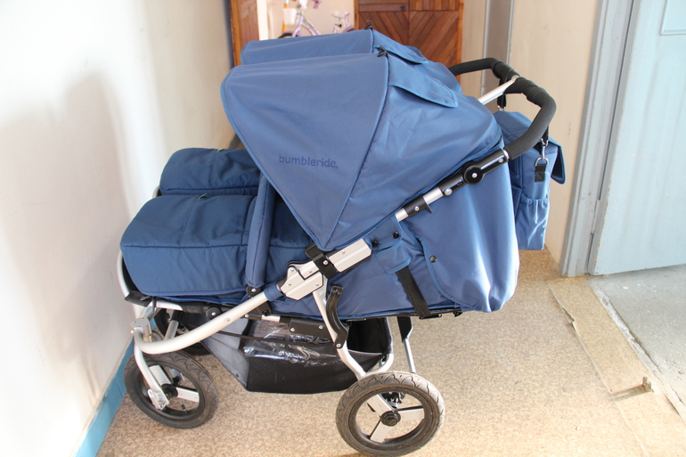 Да внешний вид был немного получше за счет удлинившихся капюшонов, но я теперь не видела моих крох в смотровые окошки - так как они выдвинулись вперед и вообще стали непонятно для кого теперь, ну и множество дырочек по краям капа тоже не давали мне покоя - ведь я всего-то перешила и зашила капюшон на руках в нескольких местах. Для мелочей приходилось заматывать вокруг ручки москитные сетки (видно на второй фотке) и класть туда ключи, кошелек, телефон, но в момент палящего летнего солнышка я все равно прятала моих малышей под солнцеотражающую москитку, поэтому все мелочи опять были убраны в неудобные карманы по краям коляски и стоило только завибрировать моему телефону, как один из малышей тут же просыпался, так как треугольные кармашки находятся совсем близко к ним и далеко от быстрого доступа к маме, а те карманы, которые расположены на спинке сидений сзади я вообще не использовала, если малыши спят - туда доступ попросту закрыт. Вот такая вот мелочь - кармашки - а как они могут быть полезны и удобны или наоборот! Вообщем я все это переделала на следующий же день после использования, т.к. поняла что лучше буду смотреть на деток через удобное смотровое окошко, чем все время проверять их обходя коляску. На все это, конечно можно закрыть глаза и пользоваться коляской в том виде в котором она есть - но при ее использовании все время напрягаться из-за неудобств или даже беситься, потеть и злиться, делать многие вещи медленнее, то есть тратить больше времени на ерунду - расстегивание и застегивание молний, например. Да к этим молниям надо привыкнуть и расстегивать их сразу двумя руками сразу две, в противном случае поочередное одной рукой расстегивание молний будет перекашивать ваше самое дорогое существо на то на одну, то на другую сторону, а застегивать и того сложнее, так как нужно еще и придерживать спинку, так как вес малыша давит на молнию и одним движением, даже двумя руками застегнуть не получится никак! - я много времени на прогулках просидела или согнувшись простояла застегивая и расстегивая эти дурацкие молнии, а думала, что справлюсь с этим без раздражения! Нет молнии победили меня! - ну это ли не минус, спрошу я вас? Еще какой! Когда моя мама вышла однажды прогуляться с моими любимками - пол-вечера потом рассказывала какую неудобную колясу я выбрала! Все это жутко влияло на меня психологически и я начала искать ту прогулочку, которая понравилась бы мне во всем простотой и удобством в использовании и была несомненно комфортнее для моих деточек. И, рыская в ютубе видюшки наткнулась на коляску bumbleride indie twin. Видеороликов о ней, мне кажется больше чем о других колясках и ее можно было обсмотреть со всех сторон и присмотреться к каждой мелочи! Все минусы тфк - это исправленные плюсы в bumbleride. Я пересекалась в магазинах с этой коляской 2 раза! но из-за того, что ее люльки крепились не на саму колесную базу, а на прикрепленную прогулку к ней и из-за этого немного портился сам внешний вид этой коляски с люльками - я даже перестала к ней приглядываться! Единственное что мне очень нравилось в этой прогулке на первый взгляд - это то, что для каждого ребеночка есть отдельный бампер (это красиво и смотрится действительно как два местечка рядом) и то, что подножка этой коляски не торчит сильно вперед, когда поднята и смотрится очень аккуратно, т.к. округлой 