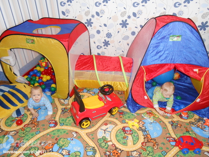 Предлагаю вот такую горочку,нам интересно до сих пор,т.е 3 месяца:)))Складывается и если что можно убрать .Сначала сами катали,потом они начали по тихому забираться,теперь во всю гоняют:)))А вместо палатки мы купили манеж с крышей Jetem quadro r,можно крышу снять и просто место безопасное для детей,а с крышей домик,на даче летом от солнца прятались в нем:))