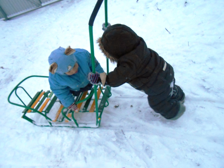 А мы своим заказали снегокат, муж к сидению прикрутит два стульчика пластиковых и будут у нас санки с рулем )))) Говорят снегокат даже легче везти, чем санки из-за широких полозьев.