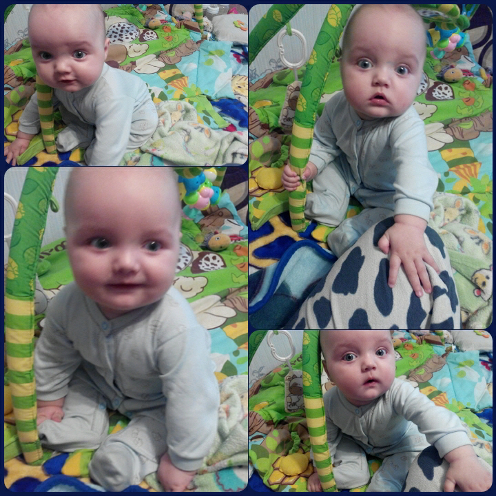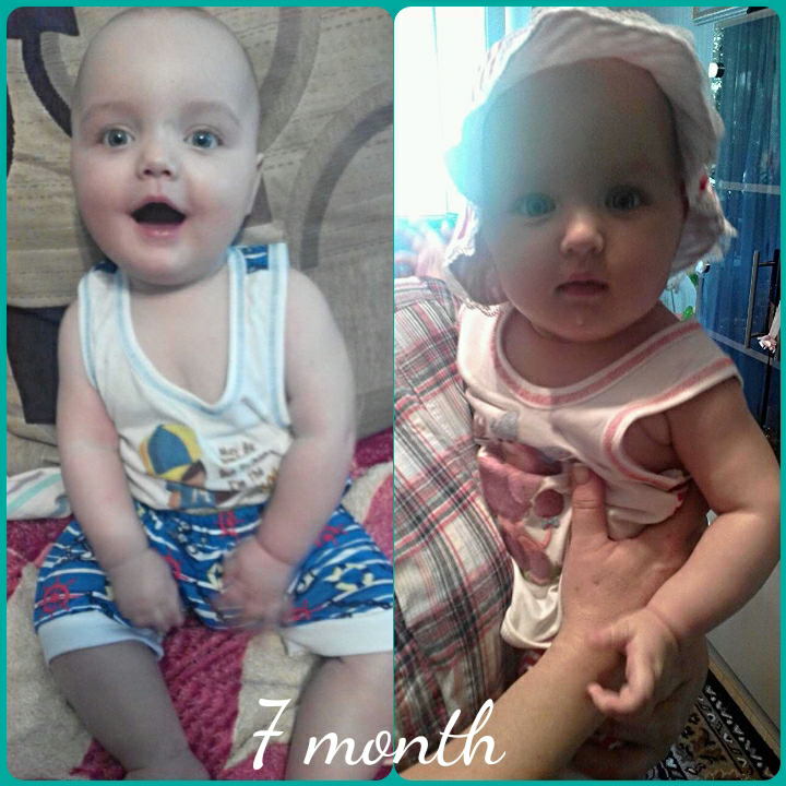 Все ещё не сидим. Ну Руслан понемногу и сидит и в ходулях ходит,а вот Катюшка нет...хотели делать массажи но случилась травма и надо ждать пока не сойдёт гематомка. Все так же по 2 зубика у обоих. Вес Руслана 9600 и 76 см,Катюха 8600 и 74 см.
