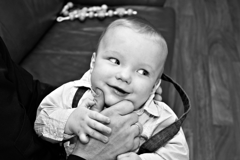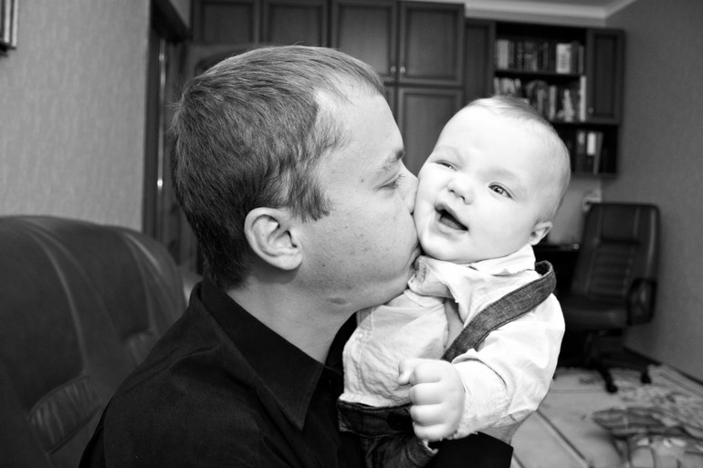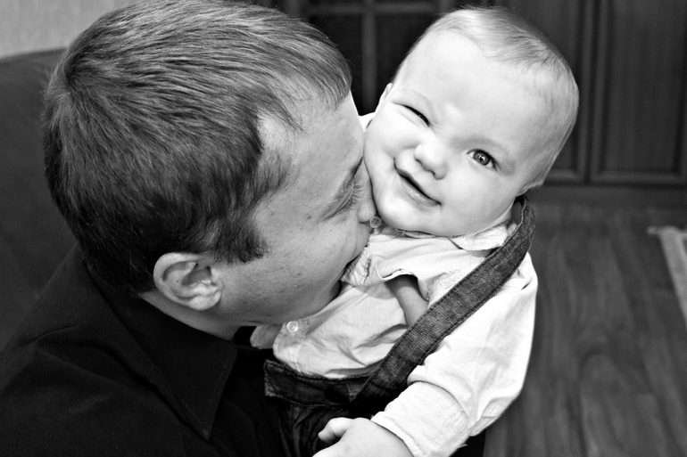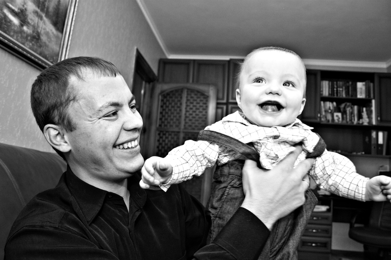 Папа веселит Леонардика, что-бы дядя фотограф сделал постановочный снимок: