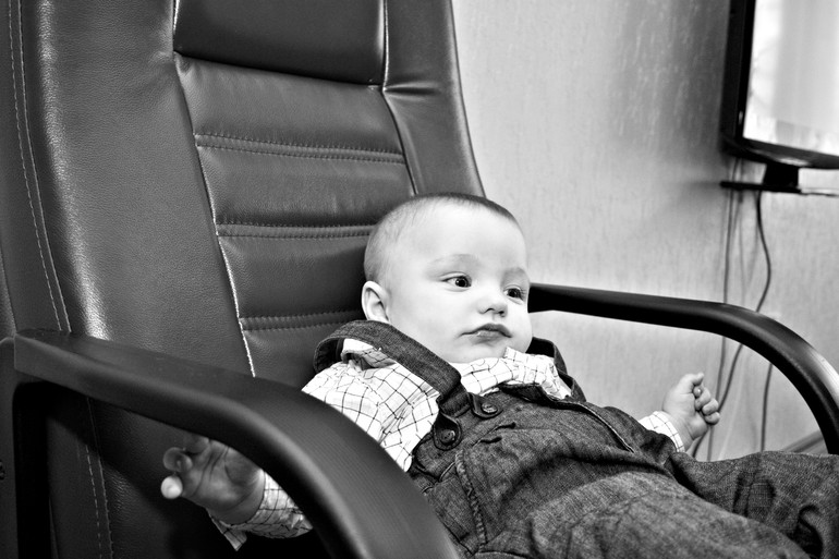 Леонардик бедняжка еще тогда не мог самостоятельно сидеть, нл уже тогда любил это вращающееся кресло: