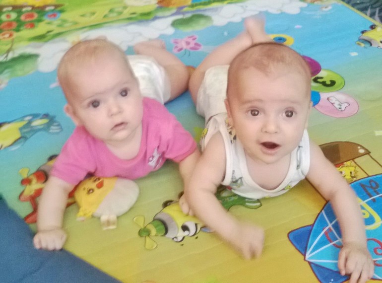 Двойняшки до 1 годаМаша со вчера пытается ползти,приподнимает жопоньку.