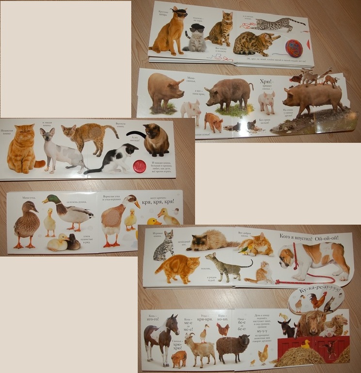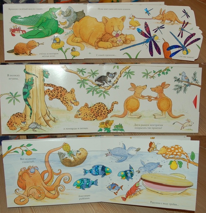 Это книги с раскладывающимися и тактильными вставками, вот несколько разворотов: