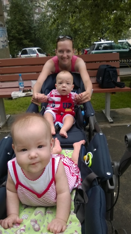 Мы трансформировали нашу коляску и теперь катаемся в прогулочных сидениях, но пока в лежачем положении - так у них больше обзор и им интереснее.