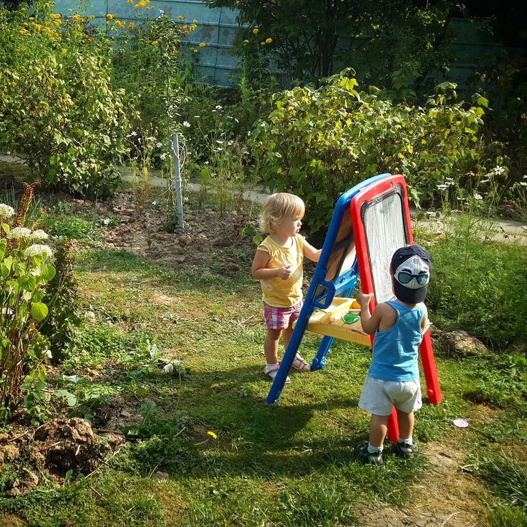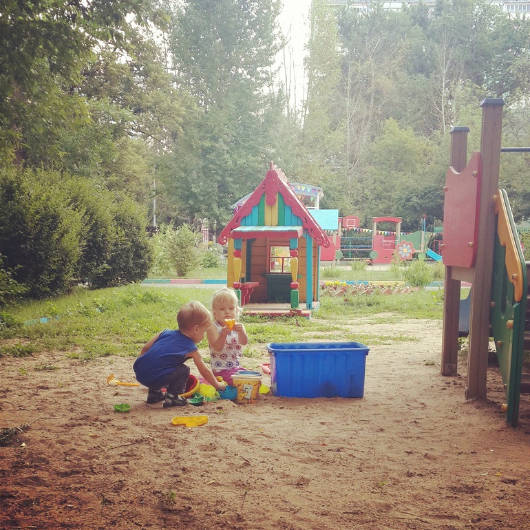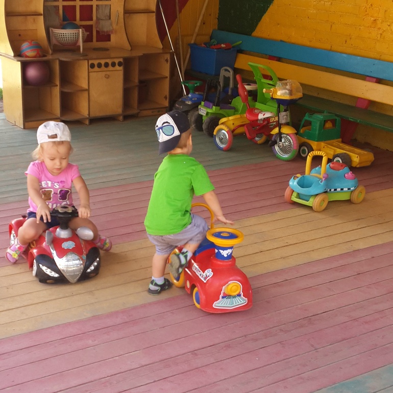 Ну а так как игрушки чужие, то есть правило "взял, поиграл, на место положил" и дети его быстро усвоили, в песочнице поковырялись, сундук с формочками\совочками раскидали, наигрались, собрали все обратно и пошли дальше кататься на машинках, а автопарк там не маленький, и ведь нужно на каждом виде транспорта примерить свою маленькую жопку)))