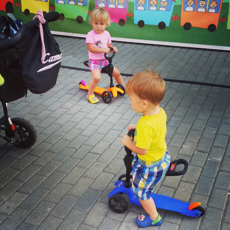 На их ДР мы подарили им по самокату Mini Micro с сидушками, восторгу не было предела, катались сначала задом наперед, потом вперед научились... потом начали заглядыватся на улице на самокаты деток постарше и при возможности старались их угнать)))