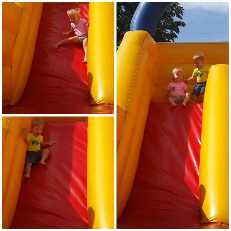Начали мы с плоского батута, без особых наворотов, по сути это надувной матрац с бордюром, на нем мелочь научилась стоять, ходить и подпрыгивать, далее мы задачу усложнили и перешли на следующий уровень сложности - батут с горкой, и тут началось настоящее веселье)))