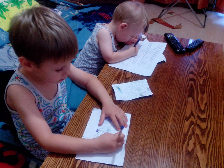 ))))У меня Савелий очень хорошо рисует,а Тим любит возле него возится всегда))Вот на пару теперь рисуют!Правда,кругляшики научил папа его рисовать,теперь только их и рисует))