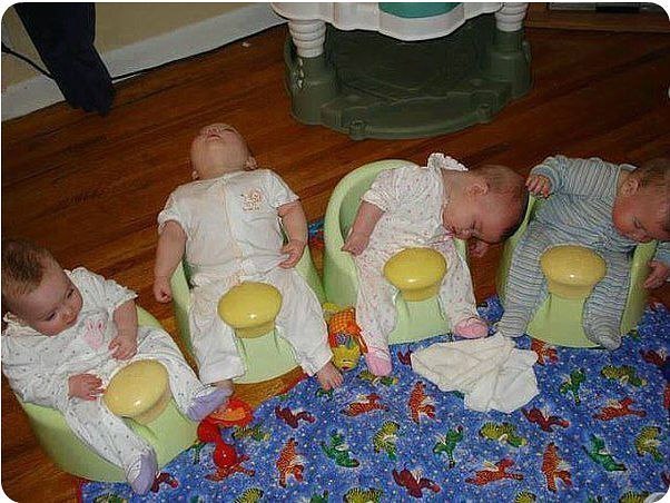 Умора ))))))))))))) Спеклись детки ))))) Родители наверное еще прикольней с четверней та вырубаются )))У меня когда деткам месяца два было и они буквально всю семью и в хвост и гриву имели по ночам и днем тоже...в общем мы ходили все мочалки мочалками. Разговариваю я днем с мамой своей на диване и кто-то мне на телефон звонит, я от мамы отворачиваюсь буквально на секунд 15 (при том мама эти секунд 15 назад была полным бодрячком и со мной активно беседовала), поворачиваюсь обратно а маман моя в таком отрубе сидя спит и похрапывает )))))))