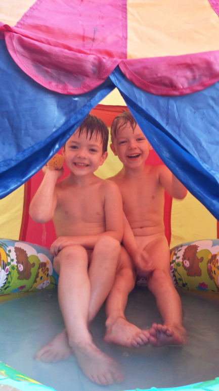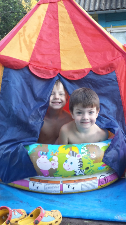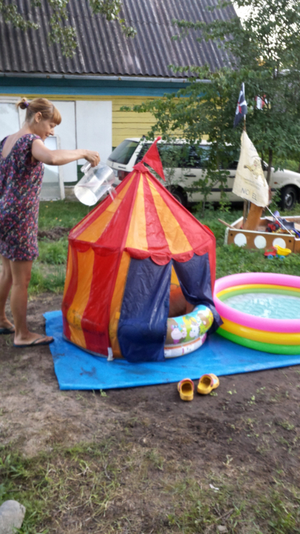 Есть у нас икеевский домик,в него засунула бассейн,наливаю воду,добавляю горячую и вуаля......баня готова.А она у нас еще и с душем))))Малые в восторге и помылись и покупались.Я сама туда залазила,супер.Эти синтетические палатки воздух не пропускают,ветер тоже и там реально тепленько,а вечера у нас уже не жаркие.Малые купаются ,а потом я их быстро в полотенце заворачиваю и в дом.Ну и конечно фото.Может кому то моя идея пригодится.